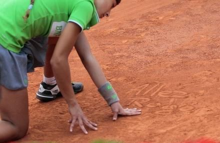 一名身穿绿色上衣、蓝色短裤的小球童屈膝蹲在场边,准备随时冲出去捡球。他的绿色护腕上已经沾满了红土,这证明他已经来回奔波了很多次。可是身体上的辛苦并没有磨灭他对费德勒的支持,在后者处于落后时,他在面前的地上用手指写下:“Allez Roger(加油罗杰)!”