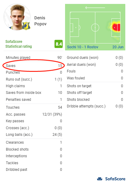 饶是如此,罗斯托夫门将丹尼斯·波波夫还是刷出了15个扑救,其中包括一次扑点。