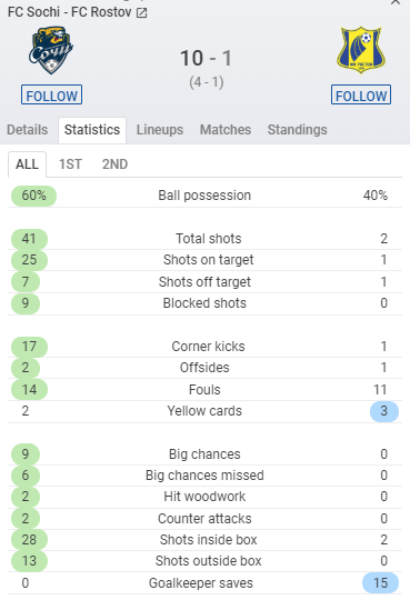 全场下来,双方的数据统计相当夸张,射门方面主队41对2,射正25对1,索契这边光是绝佳机会就有9次。