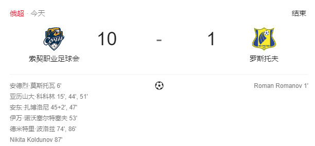 俄超今晨迎来重启,倒数第五的索契主场迎战罗斯托夫。客队在赛前一天检测出6例新冠阳性球员,索契方面拒绝延期比赛,两队大战如期而至。罗斯托夫只得尽遣U18出战,最终被对方成年队“降维打击”,以1-10的夸张比分惨败对手。