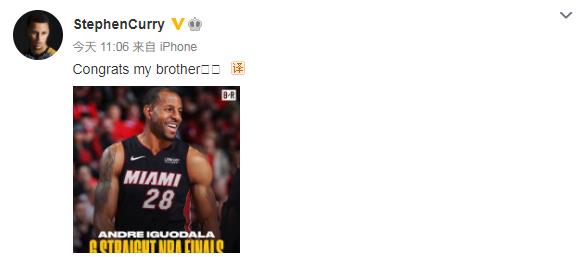 比赛结束后,勇士球星库里在个人社交媒体送出祝福前队友、好兄弟:“恭喜!我的老大哥!”
