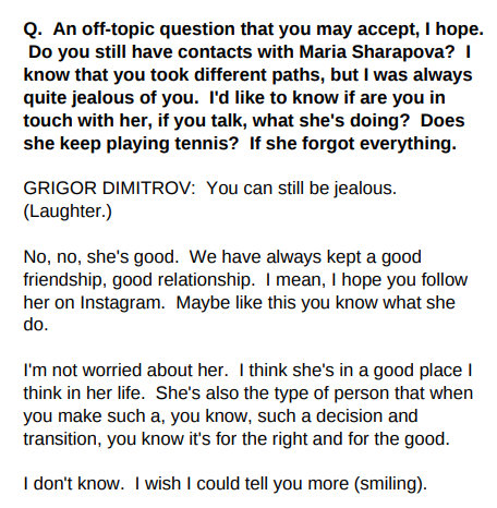 记者:“我希望你能回答一个题外话。你是否还和莎拉波娃有联系?我知道你有特别的渠道,这让我很嫉妒。我想知道你是否还和她有联系,如果有的话,她现在在干嘛?还打网球吗?是否忘记了所有事?”