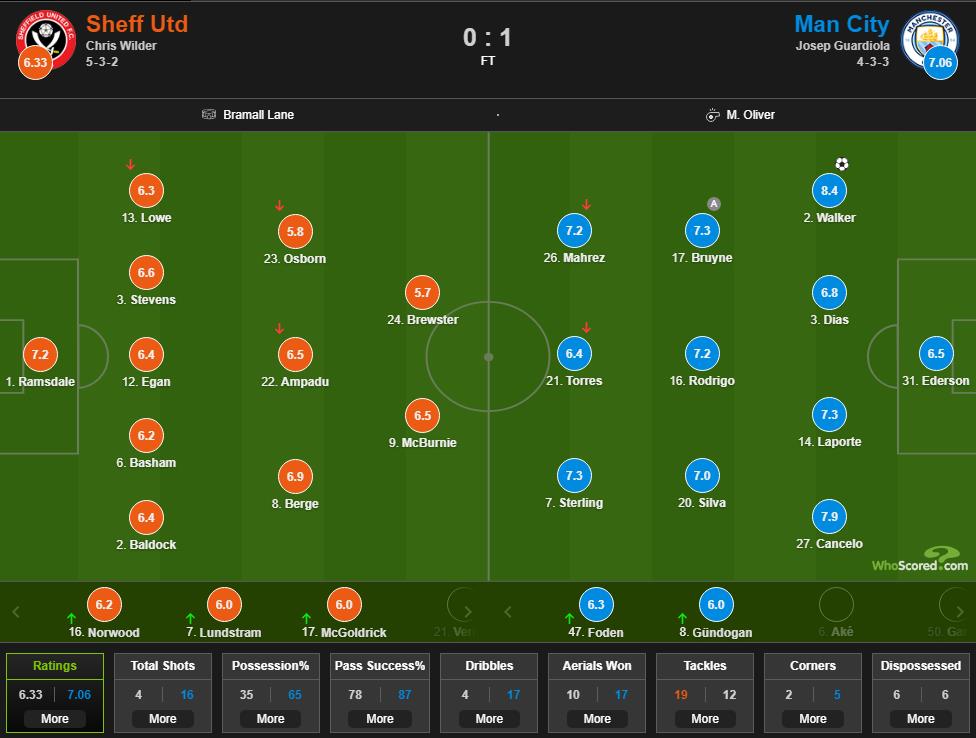 本场比赛攻入唯一进球的曼城右闸凯尔-沃克获评全场最高的8.4分,创造多次机会的左后卫坎塞洛成为本场评分第二高的球员,谢菲联门将拉姆斯代尔本场比赛做出7次扑救,并且有多次化解威胁球的表现,但由于出现了1粒失球,他获评谢菲联全队最高的7.2分,在双方所有球员中却只能位列第6。