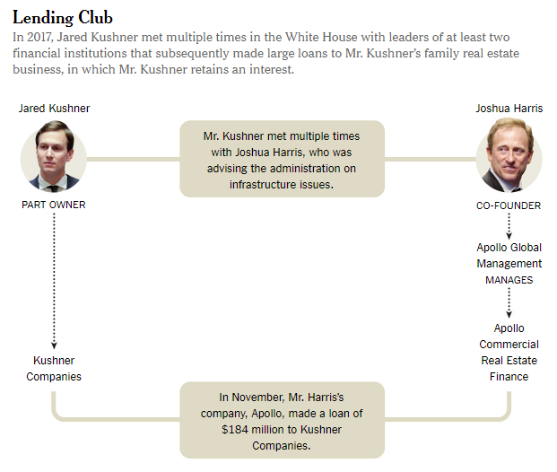 据《纽约时报》和《卫报》报道,作为阿波罗全球管理公司(译者注:一家美国私人股权投资公司)的创始人之一,这位华尔街巨鳄与特朗普女婿库什纳有过多次会面,商讨在白宫任职的可能性。尽管这份工作最终没能落实,但哈里斯的公司向库什纳家族的房地产公司贷出了1.84亿美元,用以资助位于芝加哥的一座摩天大楼。