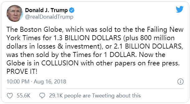 此举引得特朗普震怒,并发推攻击《波士顿环球报》曾被多次转售或贱卖,如今又与其他自由派媒体勾结在一起。