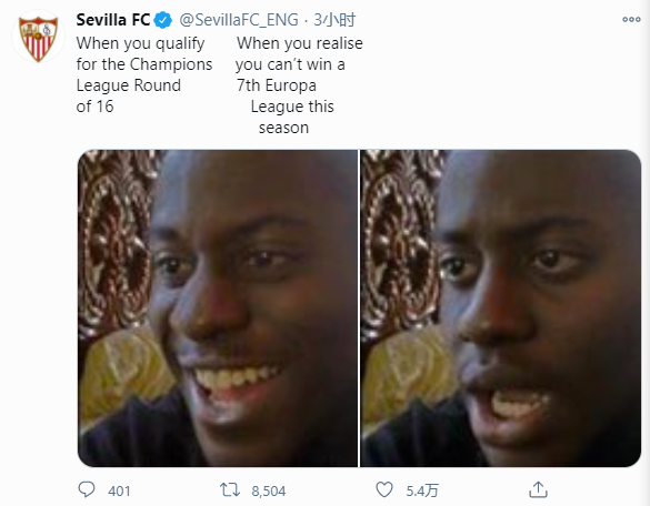赛后,塞维利亚英文官推调侃:“晋级欧冠16强了很开心,但一想到没机会拿第七座欧联杯,就哇的一声哭了出来。”