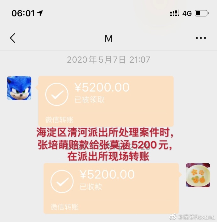 4、 2020年5月7日,我因被张培萌家暴而报案于海淀清河派出所。请问哪个星球的警察会帮我逼你写悔过书?会帮我逼你下跪道歉?(警察都气笑了吧)这里没有下跪没有悔过书,只有结案书“判定张培萌给张莫涵道歉并赔款5200元”(数额是警察给的建议,因为要过520了)。到离婚官司开庭时法院才有权调取该案件的材料,而我这里有当时张培萌的转账记录。