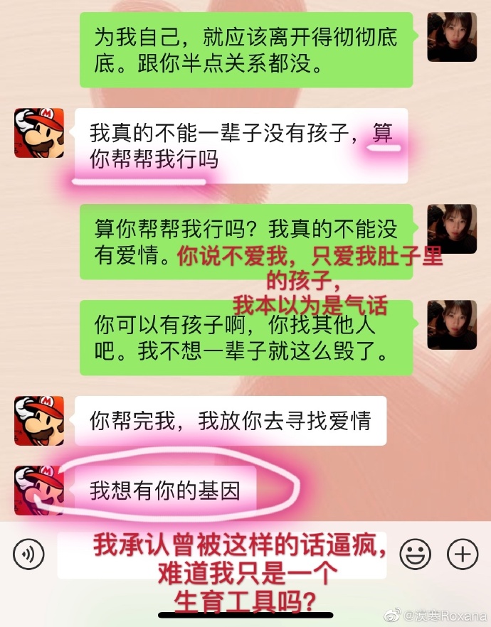 7、 我情绪确实崩溃过很多次,在我怀孕情况稳定后,孩子的爸爸亲口对我说,“我只是想要孩子”、“我想要你的基因”、“不想要你”。