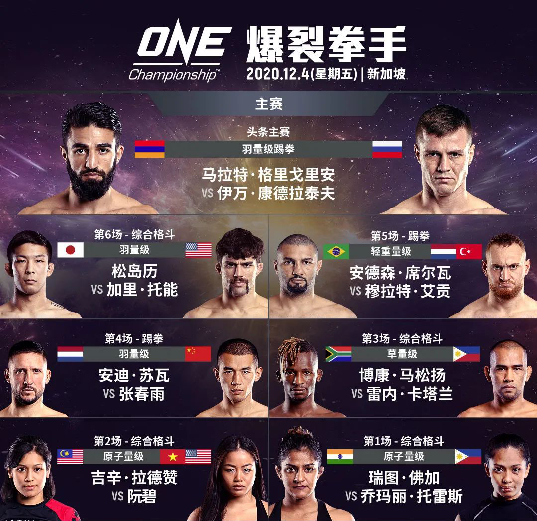 在当晚的头条主赛中,被誉为踢拳70公斤世界第一的马拉特将进行ONE冠军赛擂台首秀。自从今年8月签约ONE 冠军赛之后,人们就一直期待着马拉特-格里戈里安出战。这位29岁的搏击名将有着63胜11负1平1无结果的战绩,获得过K-1世界冠军、诸神之战总冠军、Glory轻量级世界冠军。在今晚,他将对战31岁的两届俄罗斯踢拳冠军伊万-康德拉泰夫。