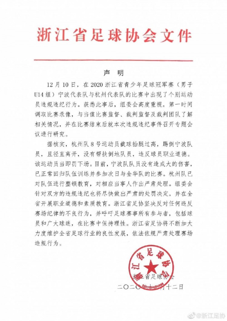 据核实, 杭州队8号运动员截球抬腿过高,踢倒宁波队员,且径直离开,没有帮扶倒地队员,违反球员职业道德。该运动员当即罚下场。目前,宁波队队员没有造成大的伤害,已正常回归队伍训练并参加次日与金华队的比赛。杭州队已对队伍进行整顿教育,对相应当事人作出严肃处理。组委会针对双方的违规违纪也将尽快做出严肃的处罚决定,并在全省开展职业道德和素质教育。浙江省足协坚决反对任何违反赛场纪律的不良行为,并呼吁足球赛事所有参与者,包括球员和广大球迷,在比赛中保持理性。浙江省足协将不断加大力度维护全省足球行业的良性发展,依法依规严肃处理赛场违规行为。