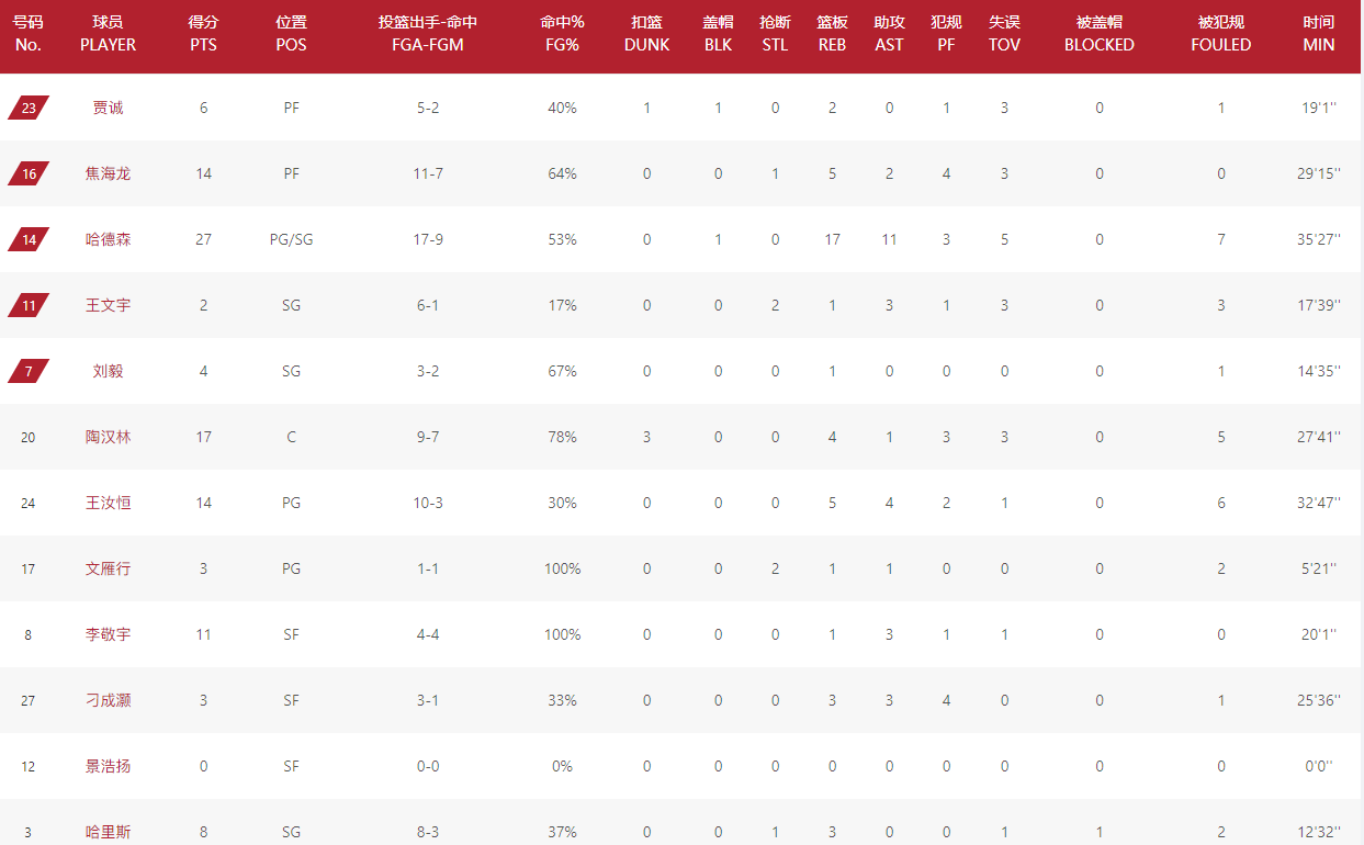 山东:哈德森27分17篮板11助攻、王汝恒14分5篮板4助攻、陶汉林17分4篮板、焦海龙14分5篮板2助攻、李敬宇11分3助攻、哈里斯8分、贾诚6分2篮板、王文宇2分3助攻2抢断、刘毅4分、刁成灏3分3篮板3助攻。