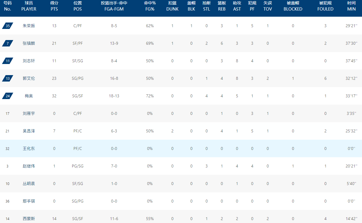 辽宁:梅奥32分4篮板5助攻4抢断、郭艾伦23分4篮板8助攻、张镇麟21分6篮板3助攻2抢断、朱荣振13分3篮板、西蒙斯14分2篮板2助攻、刘志轩11分8助攻、吴昌泽7分4篮板、赵继伟1分4助攻3抢断、