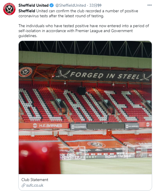 谢菲尔德联队官方宣布,在最新的一轮检测中,俱乐部出现了多例新冠检测呈阳性的病例。