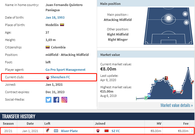 德国转会市场显示,哥伦比亚中场金特罗正式加盟深足,转会费为800万欧元,双方签约3年。