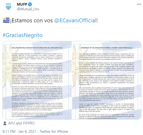 包括迭戈·戈丁、卢卡斯·托雷拉等乌拉圭球员纷纷转发了这份公告,表达了对卡瓦尼的支持。