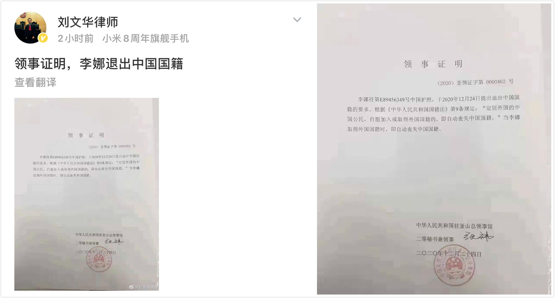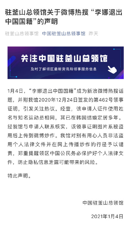 中国驻釜山总领事馆:经查,该申请人证件使用姓名与知名运动员相同,其已在韩国结婚定居多年。经我馆与申请人联系核实,该领事证明图片系被盗用后上传到微博炒作。我馆对别有用心人员非法盗用个人法律文件并在网上传播炒作的行径予以谴责,郑重提醒领区中国公民务必保护好个人法律文件,防止隐私信息泄露可能带来的风险。