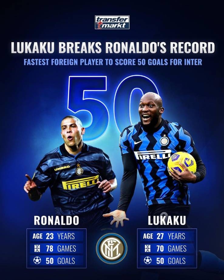 在上周国米6-2大胜克罗托内的比赛中,卢卡库传射建功,这也帮助他解锁了国米50球的里程碑。据悉,大罗在为国米效力期间78场打入50球,而卢卡库达成国米50球只用了70场比赛。