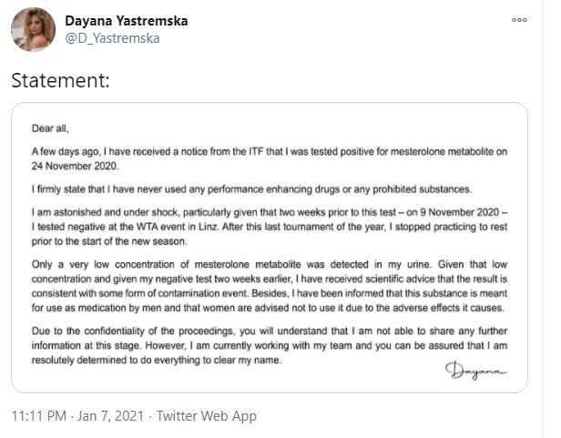 乌克兰新星随后在社交媒体的一份声明中写道“几天前,我收到了一份来自ITF的通知,我被检测出美睾酮代谢物呈阳性,我坚决声明,我从未使用过任何提高成绩的药物或任何违禁物质。”