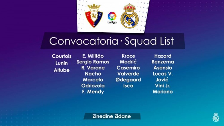 今晨皇马官方公布了本轮联赛客战奥萨苏纳的大名单,上轮因身体不适缺席的拉莫斯将回归,卡瓦哈尔累计吃到五张黄牌,无缘本轮比赛。此前成为新冠密切接触者的齐达内核酸检测结果为阴性,可以带队出征。本场比赛将于明晨4:00开球。