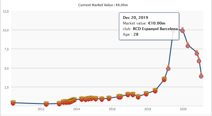 当武磊跟随西班牙人征战西甲联赛时,其个人身价也达到了职业生涯的最高值。2019年12月20日更新的球员身价信息中,武磊的身价达到了1000万欧元,而在上赛季西班牙人遗憾降级后,武磊的身价出现了下滑。如今在球队主帅比森特-莫雷诺的战术体系中,武磊暂时失去了主力位置,从而导致其身价出现了较为频繁的下跌。