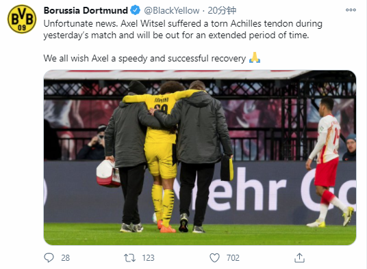 多特蒙德官方宣布,维特塞尔跟腱撕裂,将伤缺数月。