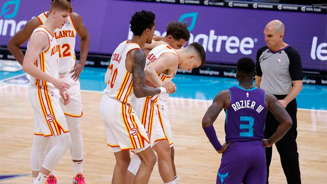 博格丹-博格达诺维奇则是在老鹰不敌黄蜂的比赛中,带球行进间一刹那直接崴到脚踝+膝盖。