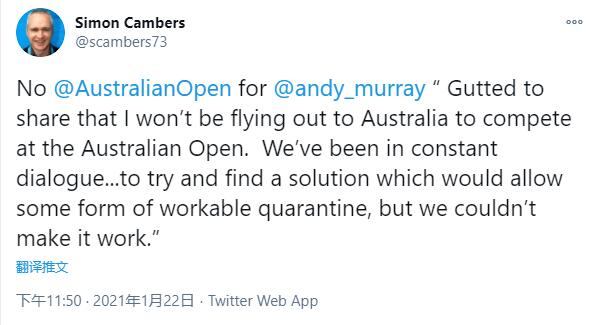 之后虽然穆雷结束隔离,但由于在与澳网组委会沟通后双方始终无法找到一个可行的隔离解决方案,穆雷因此只能遗憾缺席本届澳网!此前澳网就因为防疫隔离政策导致球员反对之声此起彼伏;如此舆论压力之下,澳网方面即便想给穆雷的参赛开“绿灯”也会变得非常困难!