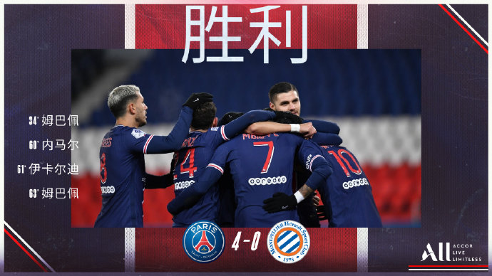 北京时间1月23日凌晨04:00,法甲第21轮,巴黎圣日耳曼主场迎战蒙彼利埃。上半场不到20分钟,门将奥姆林放倒姆巴佩染红,内马尔的任意球攻门产生折射稍稍偏出,姆巴佩挑射破僵;易边再战,姆巴佩助攻内马尔破门,随后自己推射空门完成双响,伊卡尔迪传射建功。最终,巴黎4-0大胜蒙彼利埃继续排在榜首。