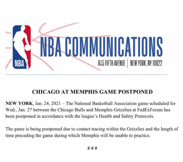北京时间1月25日,NBA官方宣布,根据健康与安全协议,1月28日芝加哥公牛与孟菲斯灰熊的比赛将延期进行。