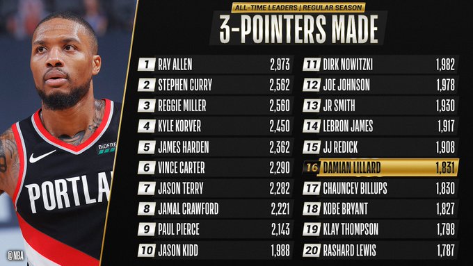 加上这记三分,利拉德常规赛三分命中数来到1831记,超越活塞名宿比卢普斯(1830)升至联赛历史第16位,前面一位是雷迪克(1908)。