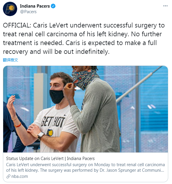北京时间1月27日,NBA步行者队官方宣布,球队后卫卡里斯-勒维尔现已成功接受左肾的肾细胞癌手术。该手术由印第安纳州印第安纳波利斯市社区北部医院的Jason Sprunger博士进行。手术很成功,勒韦尔无需进一步接受治疗,但是他将无限期缺阵,预计他将会完全康复。