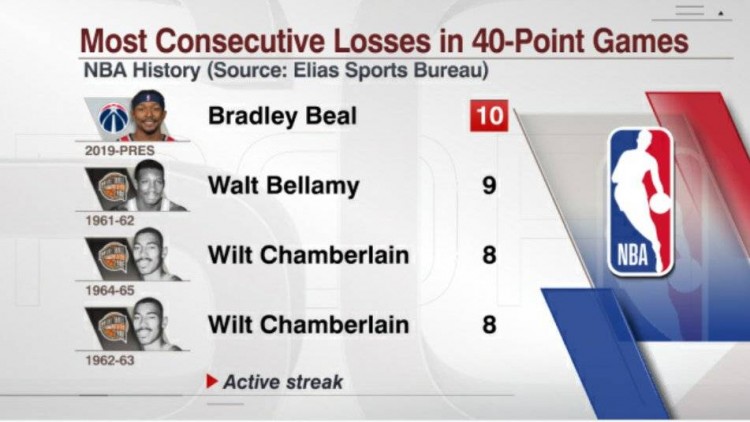 北京时间1月28日,奇才以106-124不敌鹈鹕,遭遇3连败,目前以3胜11负的战绩排名联盟垫底。比尔47分的得分是本赛季第三高得分,而最近两个赛季,比尔13次砍下40+,球队战绩仅为1胜12负。最近10次40+,奇才10战全败,比尔也尴尬地被载入史册:他成为NBA历史上第一位连续砍下40+,但球队遭遇10连败的球员!
