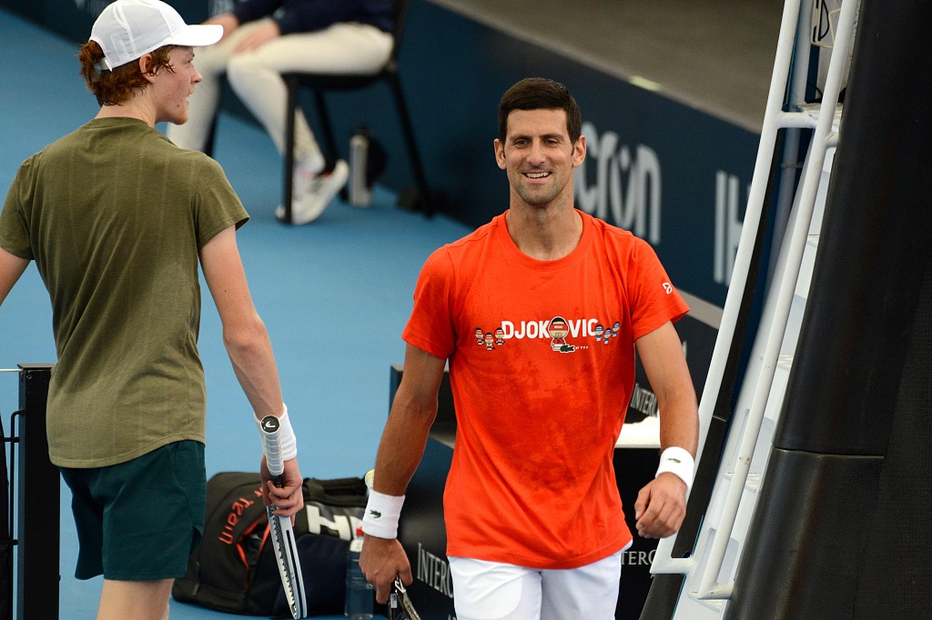 现世界第一德约科维奇在阿德莱德举行的表演赛中,携手同胞克拉吉诺维奇以6-3/6-3的比分战胜意大利小将辛纳。