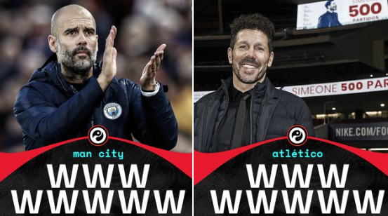 而西蒙尼与瓜迪奥拉的出色执教战绩也分别让两人的球队在各自联赛中暂居榜首。