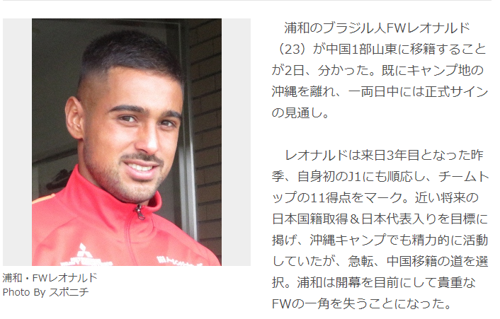 据雅虎日本报道,日本浦和红宝石前锋莱昂纳多即将转会至山东泰山,这名球员的转会费或可达到7亿日元,约合人民币4300万元。据此前日本媒体报道,这名巴西球员曾经梦想着入籍日本,并为日本国家队效力,但如今随着莱昂纳多即将转投中超联赛,他入籍日本的梦想也就此宣告终止。