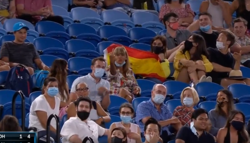 第二盘盘末纳达尔的发球胜盘局,赛中有一位女球迷一度干扰比赛,在主裁提醒之后,那个女士向场内竖中指,全场顿时嘘声四起,纳达尔也是憨憨地笑着回应,很快安保人员进场把该女士带离了球场,纳达尔随即连续轰出Ace球。
