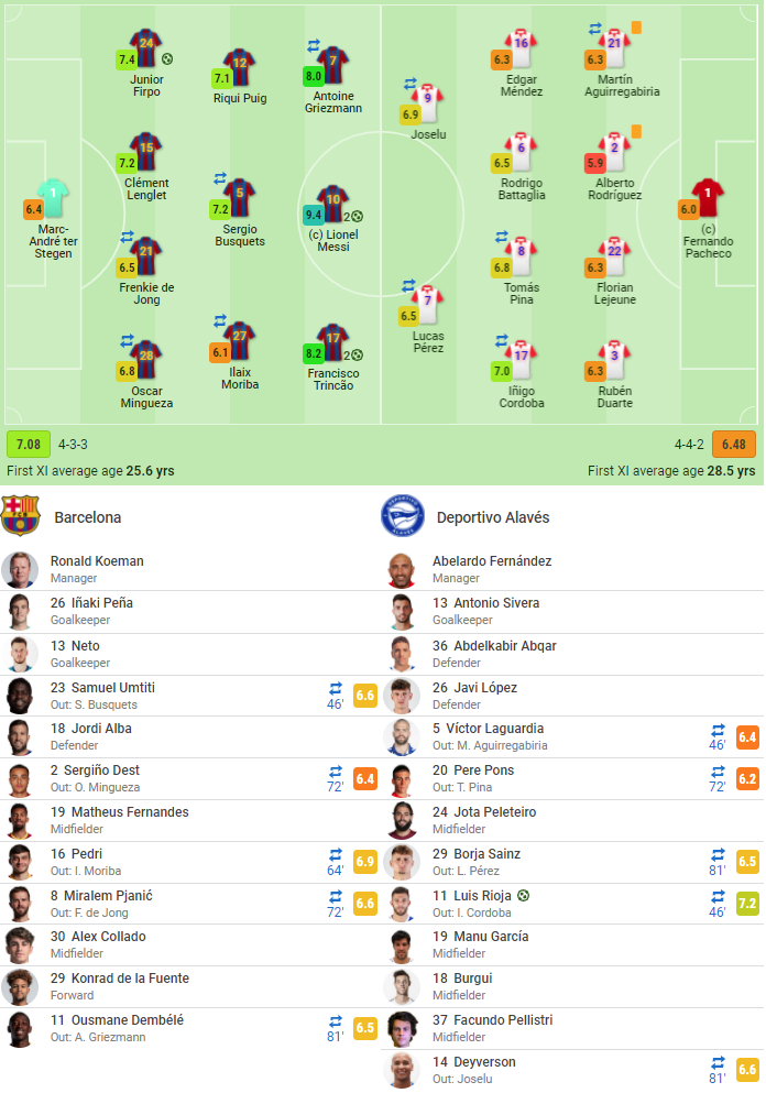 SofaScore赛后评分,梅西毫无意外获评全场最佳;阿拉维斯只有两人过7。