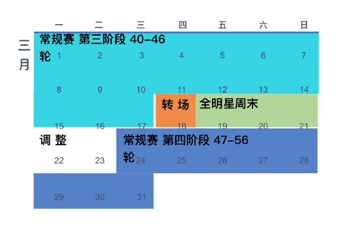 贾磊在微博中写道:“CBA此前制定了两套赛程安排的计划。一套是有国家队比赛窗口期的情况下,第三阶段比赛将放在全明星之后,于3月24号开始。还有一套计划是应对国家队窗口期比赛的取消。下图是窗口期取消情况下的计划赛程,第三阶段将在3月1日开打,3月19-21日举办全明星赛,3月24日开始第四阶段的比赛。如今亚洲杯预选赛再次延期,CBA很可能会启动第二套赛程安排的计划,将第三阶段的比赛定在3月1日开始。”
