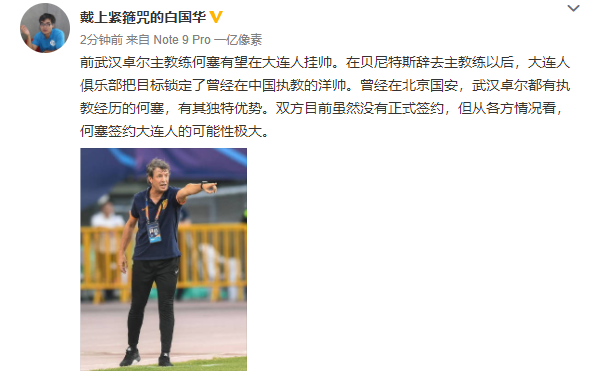 北京时间2月16日,记者白国华在微博爆料称,前武汉卓尔主教练何塞有望在大连人挂帅。