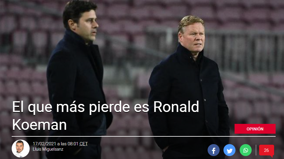 北京时间2月17日凌晨,巴萨在欧冠八分之一决赛首回合坐镇主场1-4惨败于巴黎圣日耳曼。巴萨系报纸《每日体育报》副主管Lluís Miguelsanz撰文痛批了球队表现,并将矛头直指主帅罗纳德·科曼,在标题称其为“输的最多的那一个”,甚至认为大巴黎主帅波切蒂诺应该“感谢科曼”。
