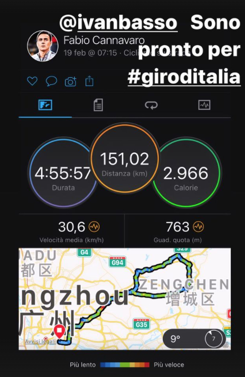 北京时间2月19日,平日里酷爱骑行锻炼的广州队主帅卡纳瓦罗今日再次更新了社交媒体动态。这一次,他又一次刷新了自己个人的骑行纪录,他用时4小时55分钟,骑行了约151公里。