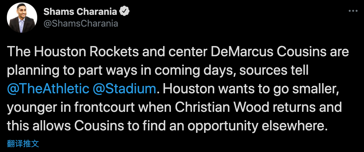 据ESPN记者Adrian Wojnarowski报道,休斯顿火箭已将球队中锋德马库斯·考辛斯的230万美元合同转为全额保障。