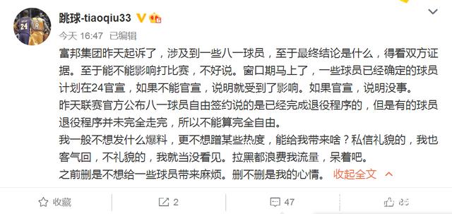 另外,跳球还在微博中表示,与辽宁达成签约意向的付豪涉及此次诉讼。
