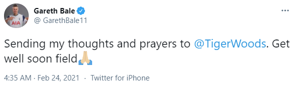 北京时间2月24日凌晨消息,高尔夫15届大满贯冠军泰格·伍兹在洛杉矶发生一起严重车祸,其所乘车辆损毁严重,伍兹双腿遭遇多处骨折并被送医进行手术,不过没有生命危险。作为高尔夫爱好者,现租借效力于英超球队托特纳姆热刺的威尔士球星加雷斯·贝尔也发推为伍兹祈祷。