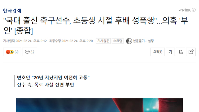 韩国媒体在报道中写道:足球运动员出身的两名当事人C某和D某,在24日通过自己的律师透露说,2000年1至6月间,在罗南道某小学上学时的足球队中,两名前辈A某和B某对自己实施了性暴力。