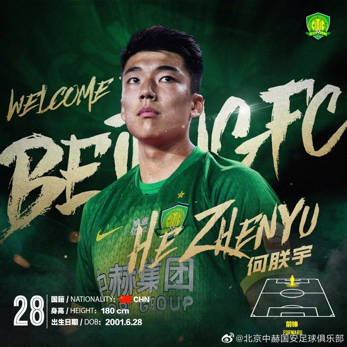 北京国安官方宣布,狼队前锋何朕宇租借加盟球队。