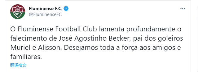 弗鲁米嫩塞足球俱乐部对门将穆里埃尔和阿利松的父亲若泽-贝克尔的逝世深表遗憾,祝他的朋友和家人能够一切安好。
