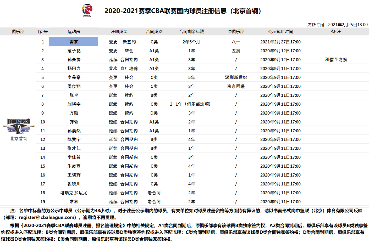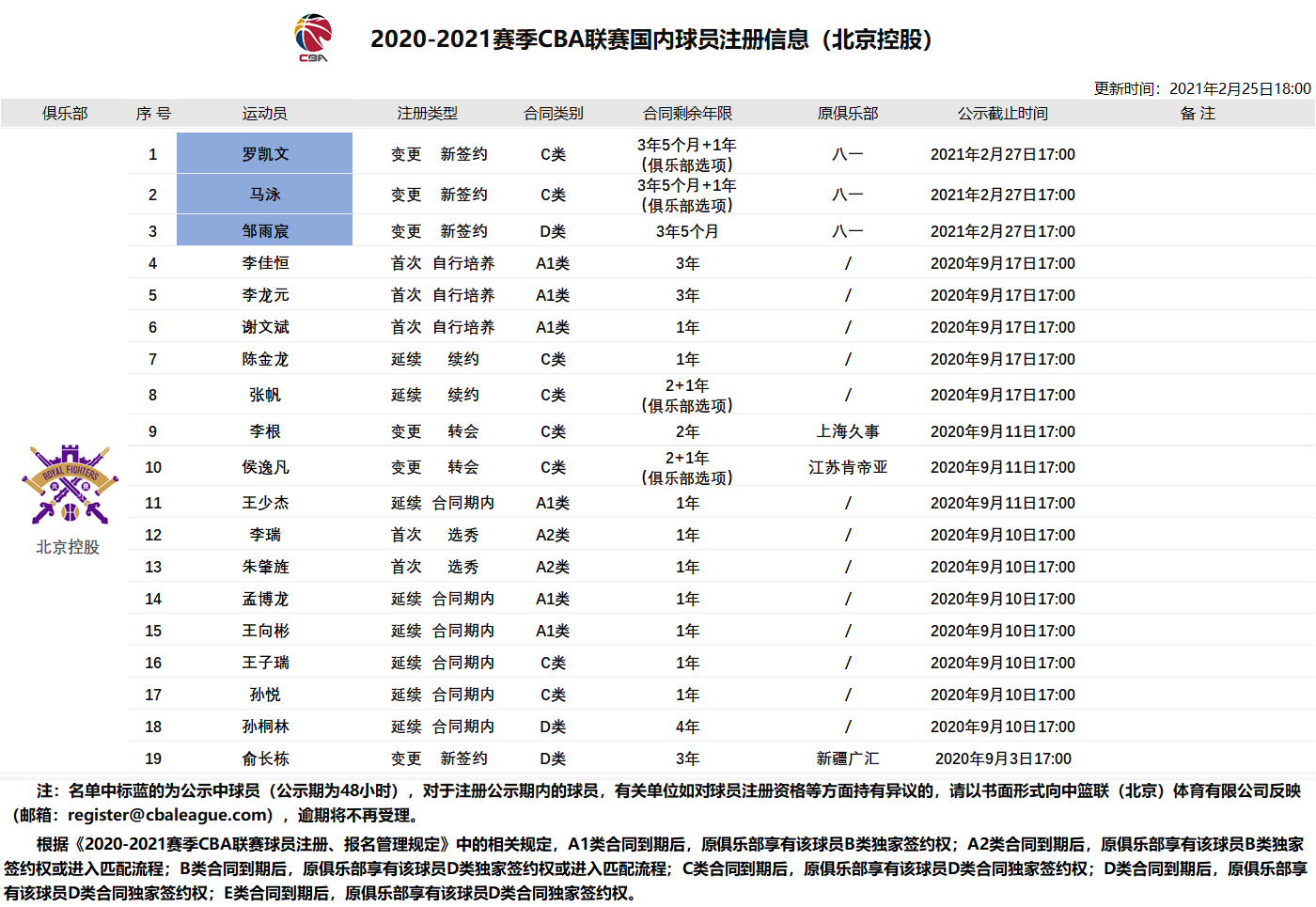 北京时间2月25日,CBA官方更新球员注册信息表:前八一球员邹雨宸正式加盟北控,签下3年5个月顶薪合同。前八一球员马泳和罗凯文也正式加盟北控男篮,均签下3年5个月+1年(俱乐部选项)的合同;前八一球员雷蒙正式加盟北京首钢,合同剩余年限2年5个月;许钟豪加盟广厦队,双方签约两年零五个月,广厦还有增加两年合同的球队选项;刘航初、王旭加盟同曦男篮。