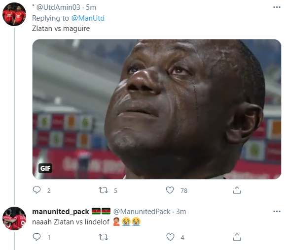 另一位曼联球迷跟帖回复:“伊布vs林德洛夫”。配上了一个捂脸外加两个流泪的emoji表情。二人之绝望可谓溢于言表。