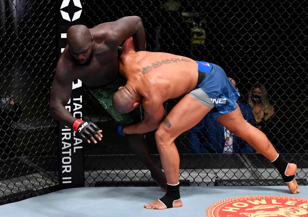 另外,作为站立系选手,盖恩其实愿意主动缠斗,他的职业战绩有一半终结获胜是降服对手。每当罗森斯楚克向前压迫,他会看准时机下潜,进而推到笼边以求达成抱摔,也确实摔倒两次,还有一次企图做裸绞。凭借稳定发挥,他通过一致判定(50-45, 50-45, 50-45)得胜。